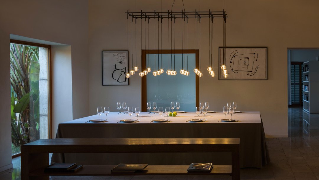 To get the best light quality on the table, a light should be installed 36 inches from the bottom of the fixture to the top of the table. That’s the standard. In a double-height room, or in cases where you’re in a larger architectural space, you can up it to 40 inches.