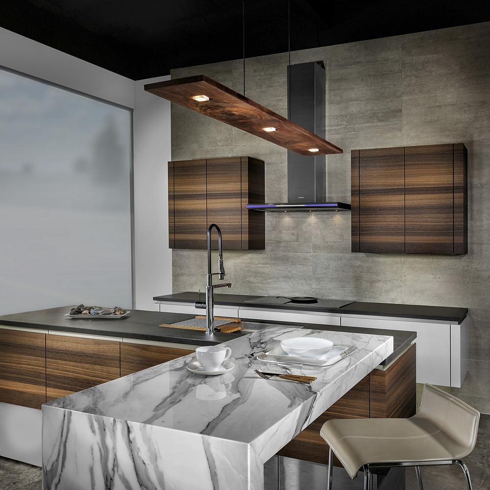 You want to select lighting that will complement the range of functions performed here, from chopping vegetables to reading recipes, to entertaining and family time. An optimal lighting plan provides the ability to control brightness for these various tasks while enhancing the overall design and providing visual cues about the central importance of this space in the kitchen. Also, make sure you have dimmers so you can adjust the mood.