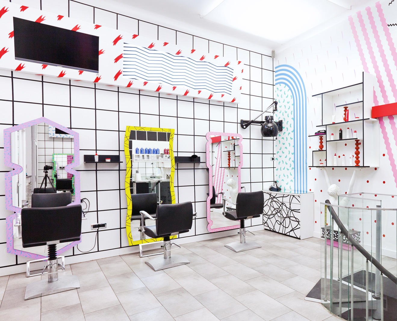 Scale can apply to time as well. Sometimes what is cutting edge is a re-imagination of the past. This salon almost vibrates with 80’s era patterns and colors. The amped up interpretation of spaces from that time becomes a fully new experience.