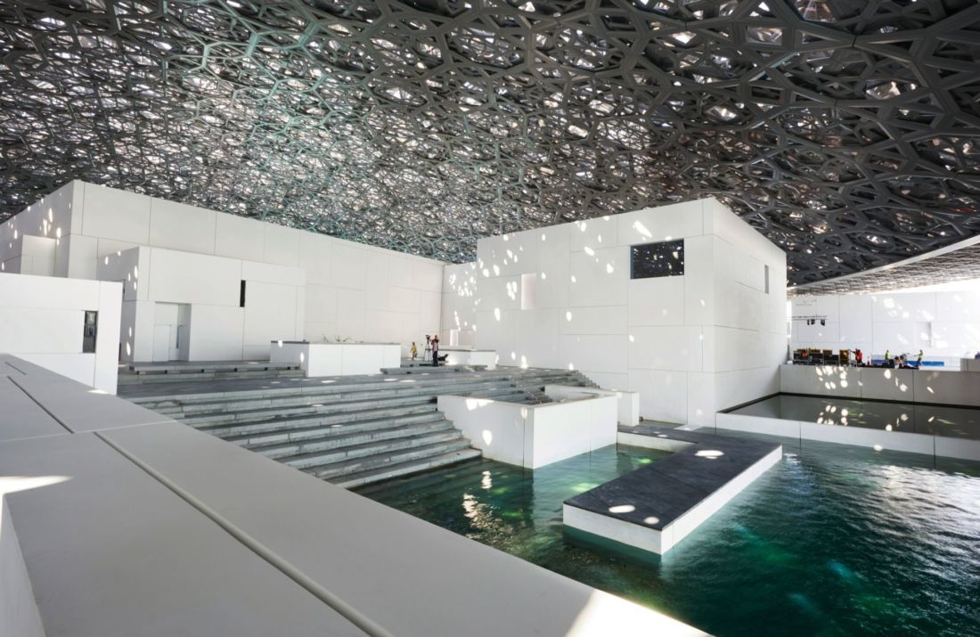 Not all avant-garde spaces are jarring. Some can overwhelm you using a more elegant touch. The stunning space of the Louvre Abu Dhabi provide a grand sweep of design. What is smart about this space is the juxtaposition of the richly detailed, pierced ceiling and the staggered stark cubes of the galleries all being lapped at by the clear blue water of the gulf.