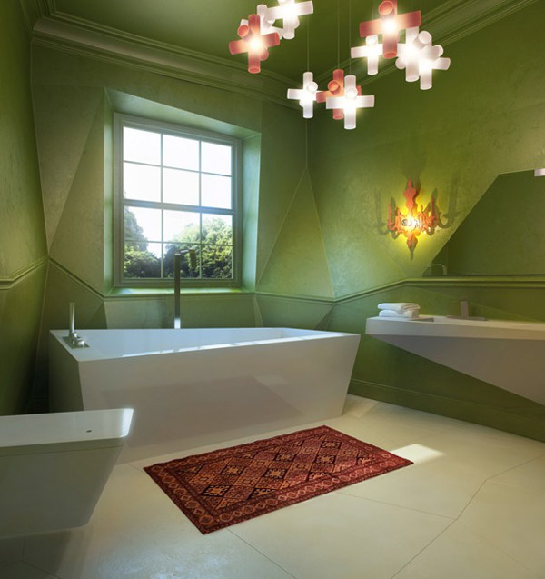 The whole effect is reinforced through contrasted colors and simple, angular, asymmetrical plumbing fixtures popping against the sickly green walls.