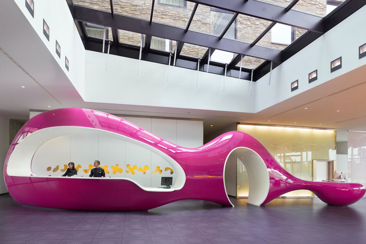 Here he sticks to his principals using many of the tricks we have seen before. The sharp contrast of the shiny fuchsia and white alien reception desk that seems to have dropped though the massive industrial skylight above provides sharp juxtaposition that garners the title. The space becomes an exercise in human emotion and practical design, creating a functional focal point that vibrates with color in the larger, starker corporate feeling space. It effectively draws you in to the place you are intended to go.