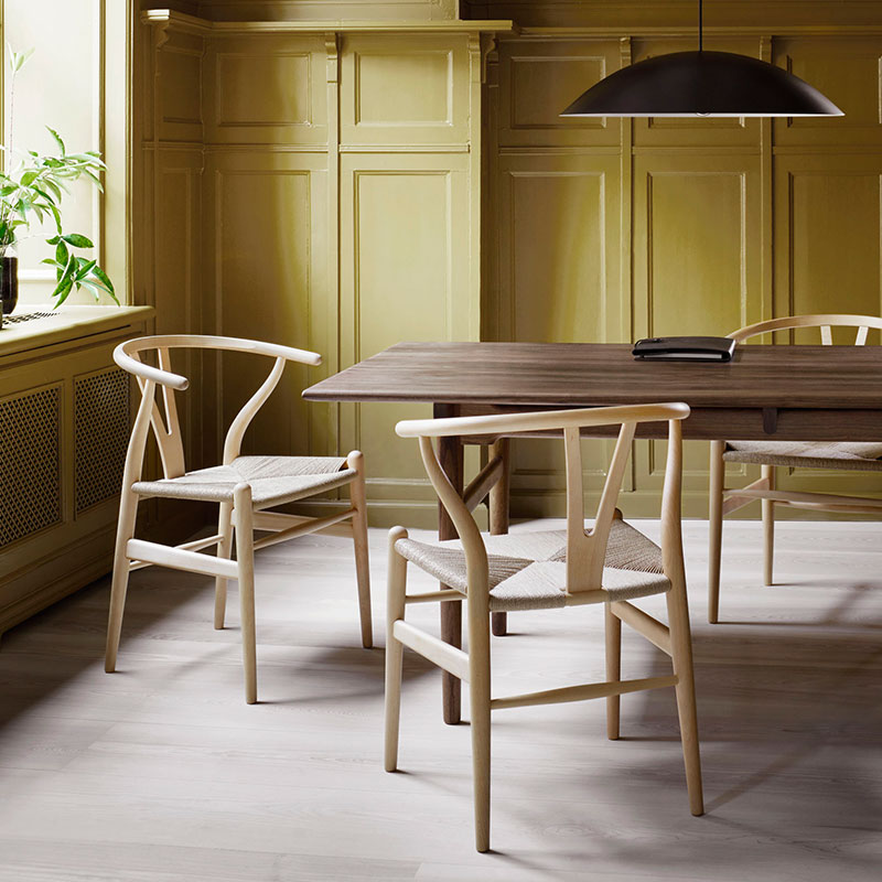 Hans Wegner’s classic dining chair design, the CH24 Wishbone Chair is a versatile modern dining chair. The solid wood frame, easily identifiable back and paper-cord seat are all there, giving the CH24 Wishbone Chair a timeless modern style.